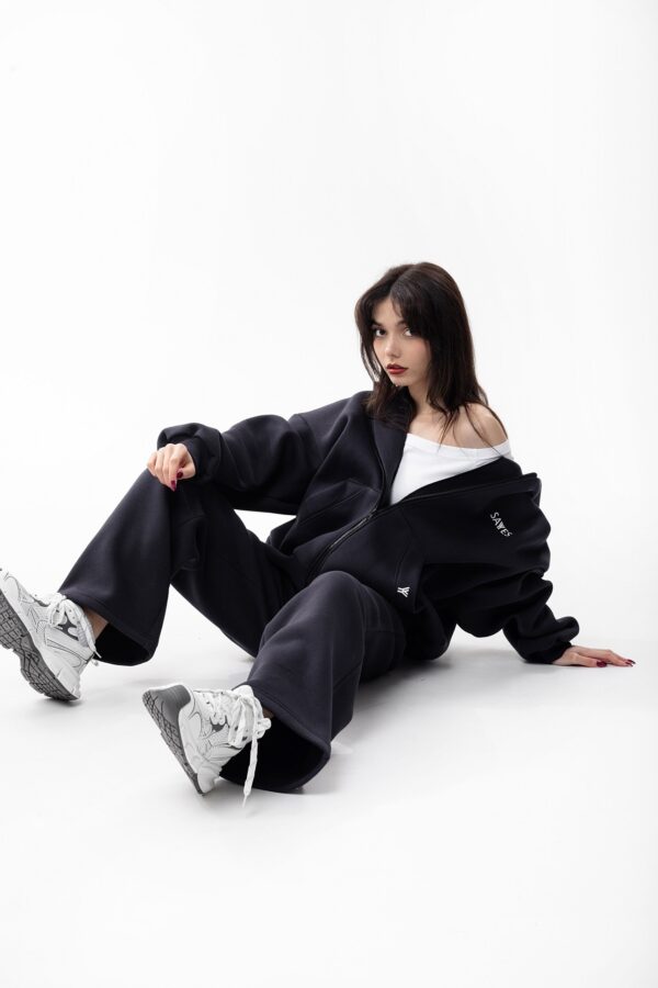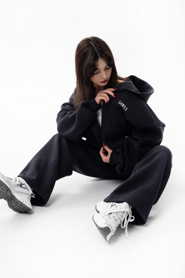 Зип худи большого объема, прямого силуэта, с капюшоном.На полочках расположены накладные карманы. Рукав рубашечный, длинный, большого объема. По низу рукавов притачные манжеты. Капюшон умеренного объема, со швом. Застежка на разъемную молнию. По низу изделия притачной пояс.